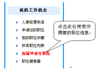 注意:如果你是應屆畢業(yè)生可以進入"個人管理中心",位于左側(cè)子欄目的"我的工作機會",點擊"應屆畢業(yè)生職位"如下圖所示:
