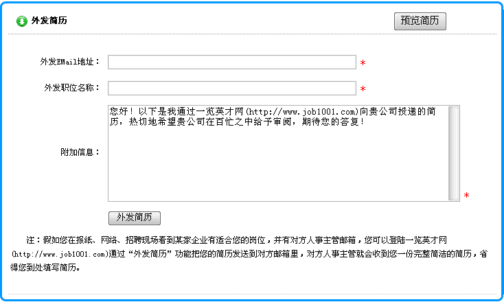 2) 在打開的頁面中,輸入接收企業(yè)的Email地址、應聘的職位名稱以及您的其它要求后,點擊"發(fā)送簡歷"按鈕就可以了。如下圖所示: